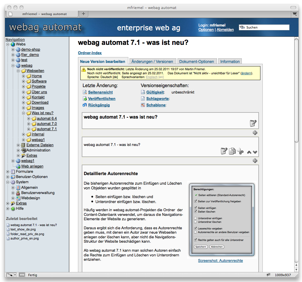 Detaillierte AutorenrechteDie bisherigen Autorenrechte zum Einfügen und Löschen von Objekten wurden gesplittet in